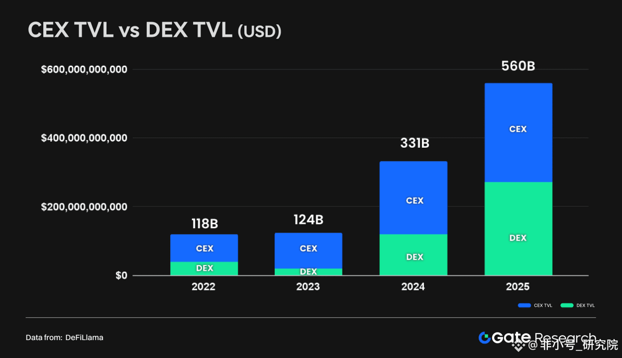 过去十年间,CEX 与 DEX 的年度交易量差距逐渐缩小。虽然 CEX 在绝对规模上仍然更大,但 DEX 的增长速度更快,甚至在部分时间段和新兴资产类别中出现了与 CEX 接近或超越的情况。与此同时,从总锁仓量(TVL)的对比来看,CEX 曾经占据绝对优势,但如今 DEX 的 TVL 已逼近 CEX,形成双足鼎立的格局。