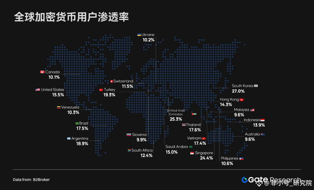 • 高渗透市:场韩国(27%)、阿联酋(25.3%)、新加坡(24.4%)、土耳其(19.3%),显示加密技术已在这些市场高度普及。高渗透市场