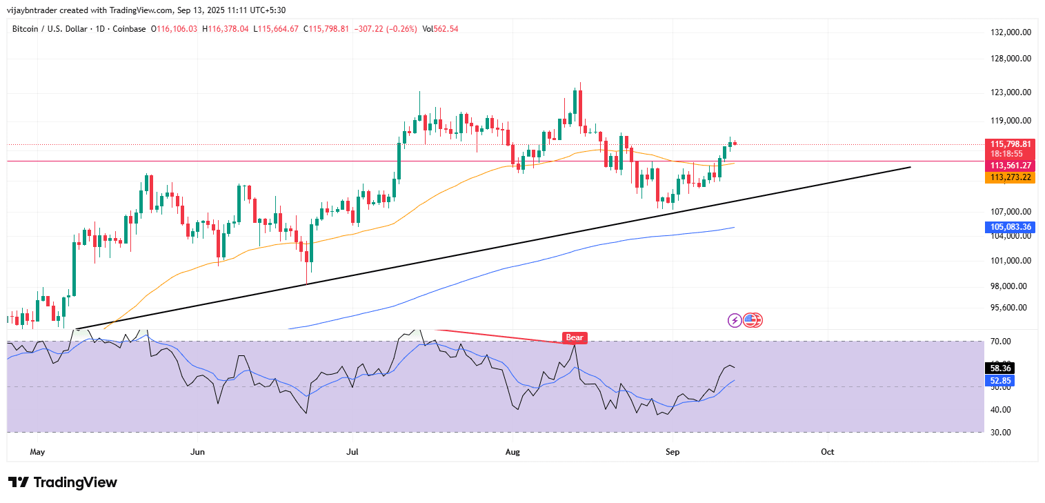 Continuazione rialzista: Chiusura giornaliera sopra 116.5K–117.0K con RSI >50 apre 119.5K–121.0K.