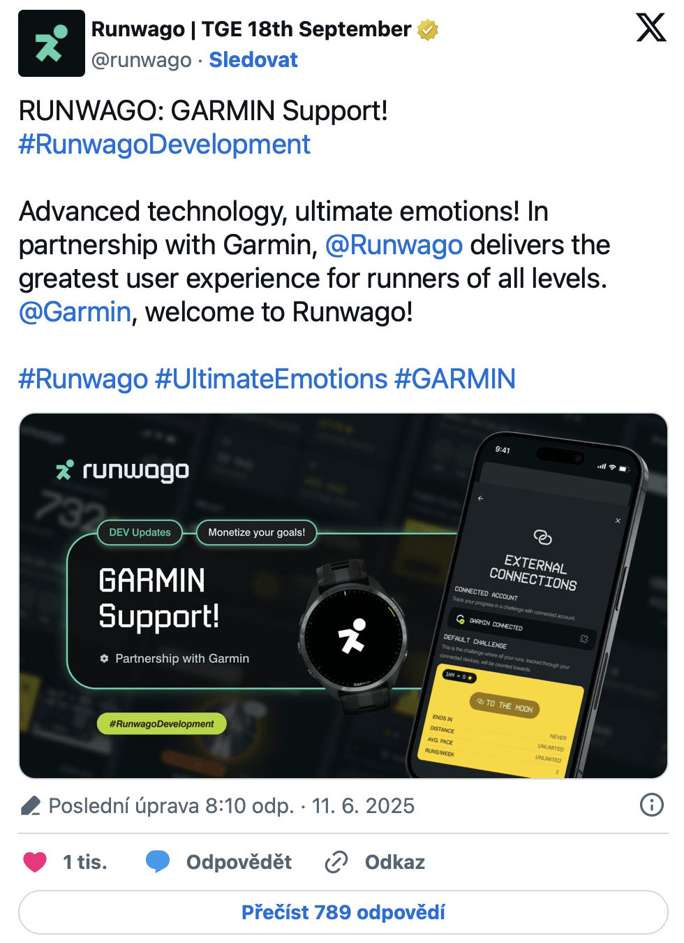 Se pensi che Runwago sia solo “un altro progetto crypto”, ripensaci. Questo progetto si distingue grazie alla sua collaborazione con il rinomato marchio GARMIN, rendendolo un vero differenziatore nel mondo della tecnologia sportiva. Questa partnership — la prima del suo genere nello spazio crypto e blockchain — consente agli utenti GARMIN di trasferire i loro dati di attività sportiva direttamente nell'app Runwago, sbloccando ulteriori vantaggi che la piattaforma ha da offrire.