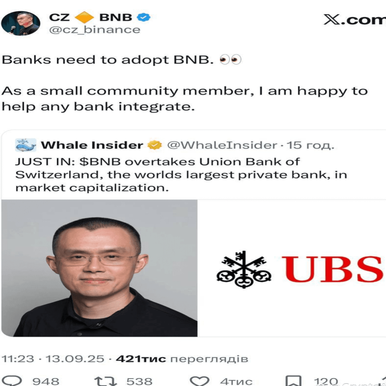 CZ ha suggerito che le banche inizino a utilizzare $BNB nei loro sistemi 🚀 Ha persino menzionato che è disposto ad aiutare personalmente qualsiasi banca che desideri portare il token nei propri servizi 🙌
