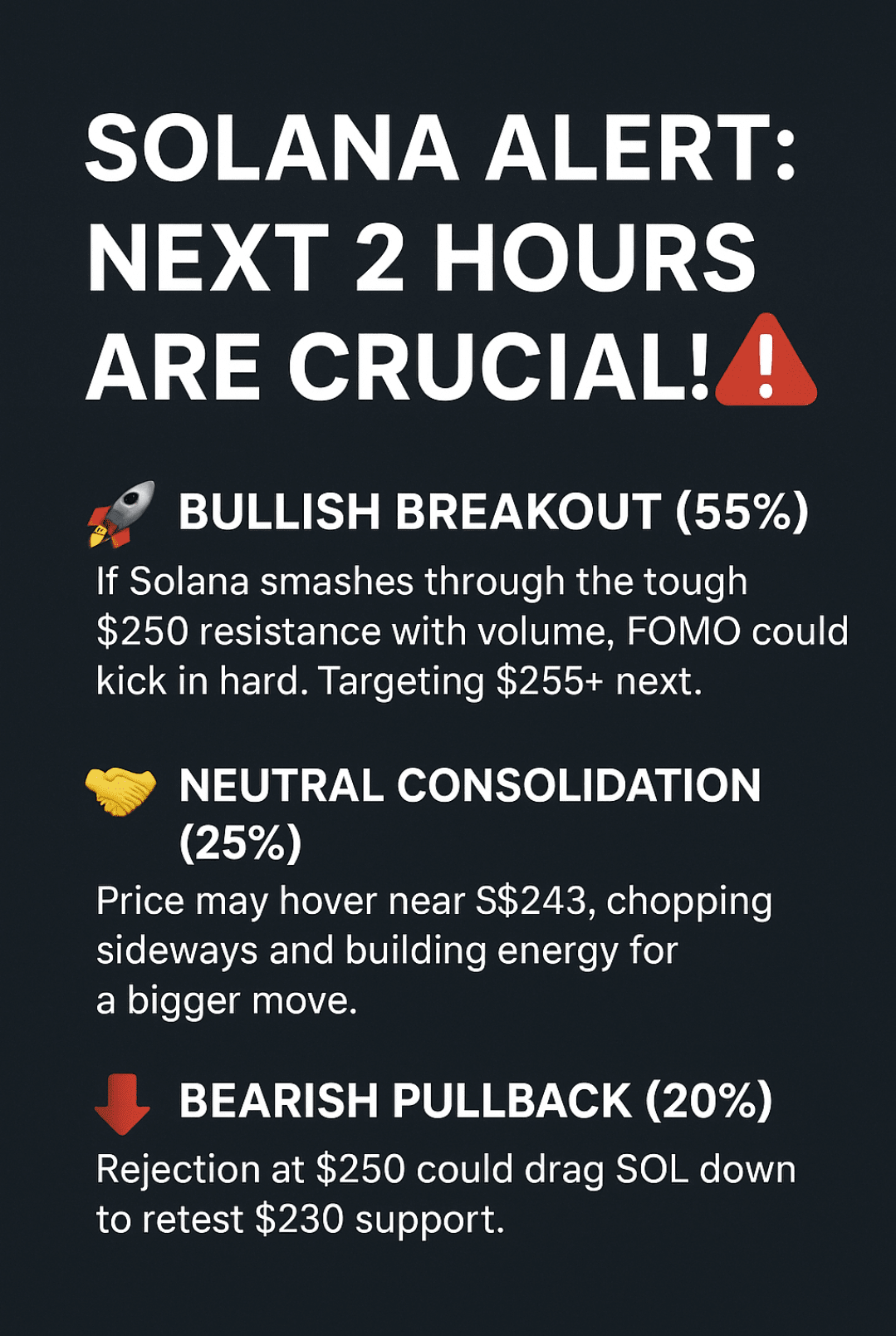 🚀 Rottura Rialzista (55%) – Se Solana rompe la difficile resistenza a $250 con volume, il FOMO potrebbe scattare forte. Obiettivo $255+ successivo.
