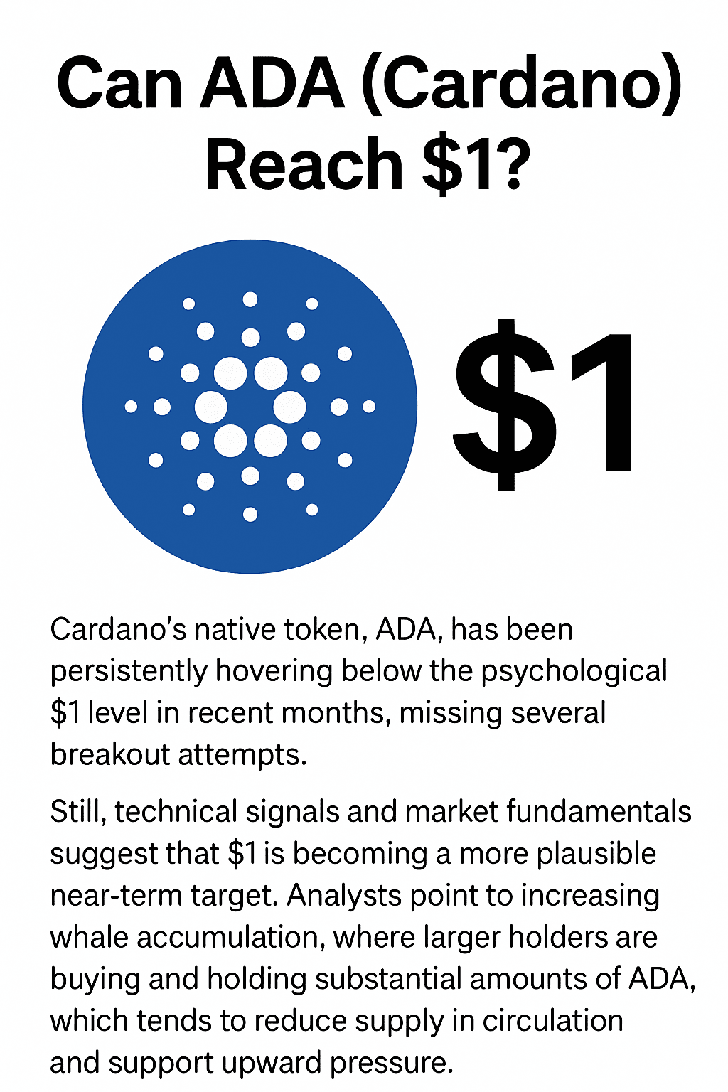 In conclusione, anche se non c'è alcuna garanzia, che ADA raggiunga $1 sembra ragionevolmente possibile nel breve-medio termine—soprattutto se il momentum rialzista cresce e i livelli di resistenza vengono superati. Ma gli investitori dovrebbero essere cauti: la consolidazione o i ritracciamenti sono probabili se il supporto chiave fallisce.
