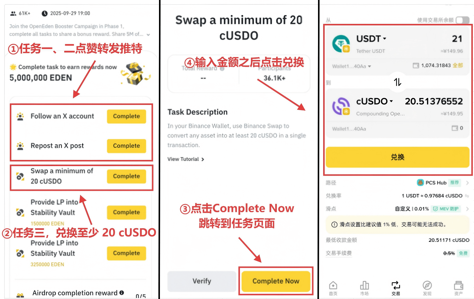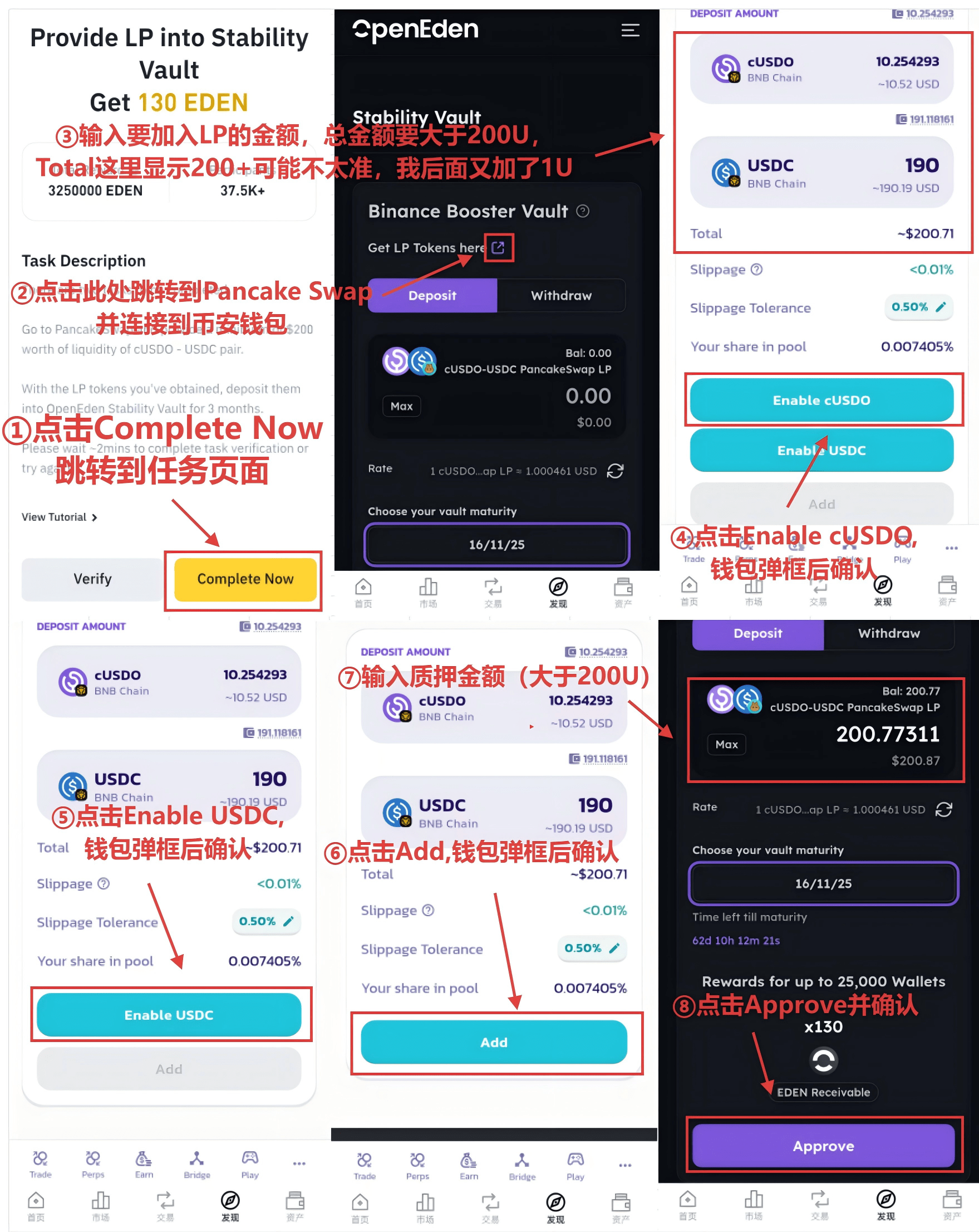 Compito cinque: fornire liquidità cUSDO-USDC su PancakeSwap (superiore a 200U), quindi impegnare i token LP nello Stabilità Vault di OpenEden per 3 mesi (estrazione per 25.000 persone, ognuna riceverà 130 EDEN)