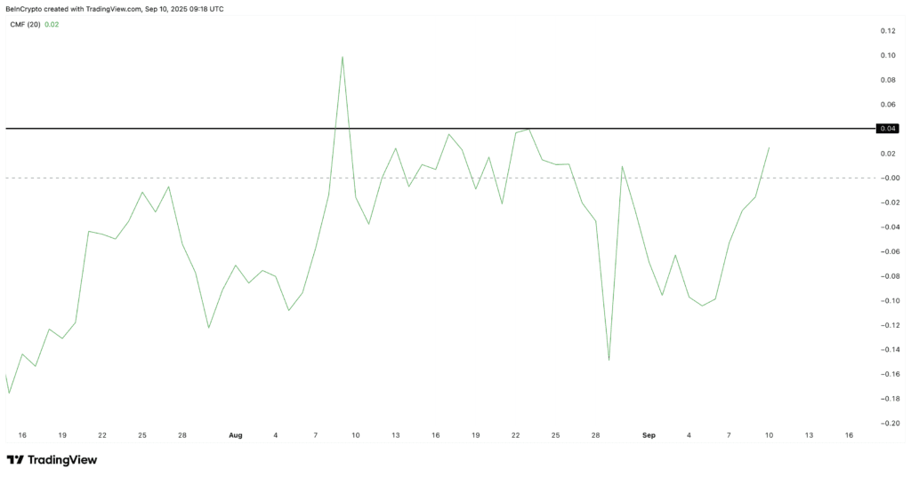 Inoltre, l'indice di Flusso di Denaro Chaikin (CMF), uno strumento importante per monitorare il flusso di denaro dentro o fuori da un asset, è passato a positivo con un valore di +0,02. Storicamente, l'ultima volta che il CMF ha registrato una simile inversione è stato il 30 agosto, quando Pi Coin ha vissuto un rapido aumento di prezzo. L'aumento del CMF proprio quando il prezzo di Pi consolida la sua relazione con BONK potrebbe non essere una coincidenza. Questo suggerisce che gli investitori si stanno preparando ad agire se il mercato dei meme coin è supportato dal lancio dell'ETF $DOJE.