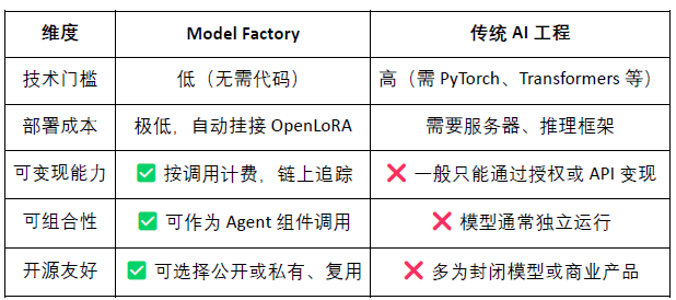 Model Factory, come strumento senza codice, ha integrato meccanismi di prova di contributo in tutti i modelli, garantendo i diritti dei contributori di dati e degli sviluppatori di modelli, con vantaggi di bassa barriera, monetizzabilità e combinabilità, rispetto agli strumenti di sviluppo dei modelli tradizionali: