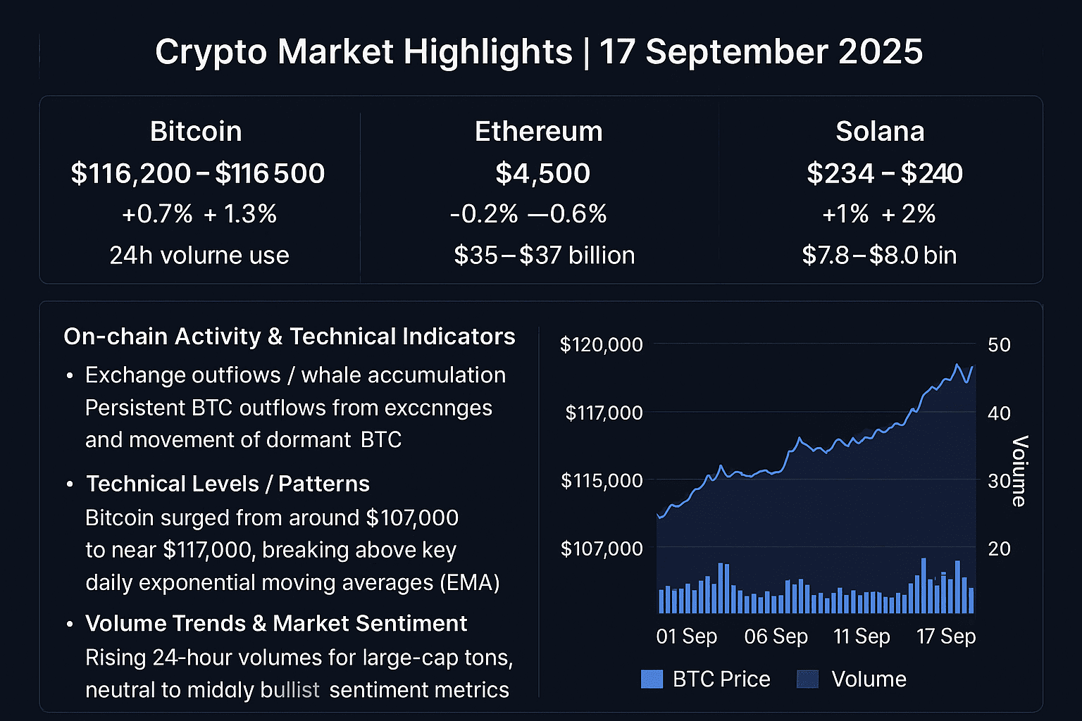 In risposta, Bitcoin è tornato a salire verso US$116.000-US$117.000, scambiandosi all'interno di una zona forte. Ethereum è tornato sopra US$4.500, mentre molte altcoin hanno mostrato prestazioni miste.