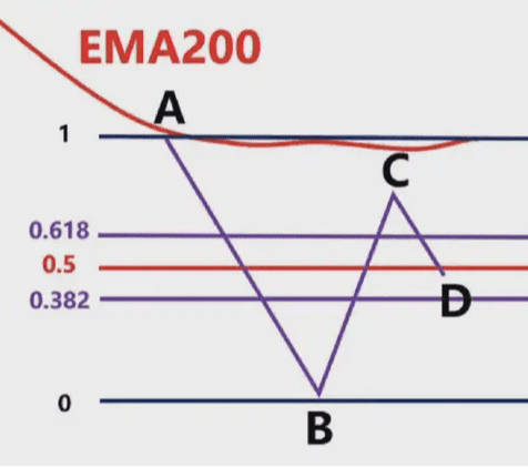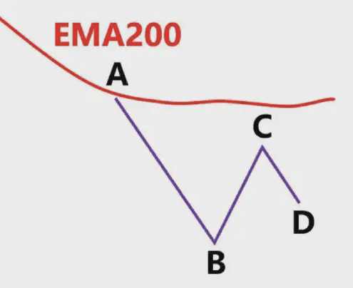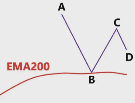 La linea blu nella figura è l'EMA200. Vediamo il punto minimo A e il punto massimo B. In questo momento, il prezzo è inferiore all'EMA200. Andiamo solo short e non long. Tracciamo una linea di supporto orizzontale verde con il punto minimo A.