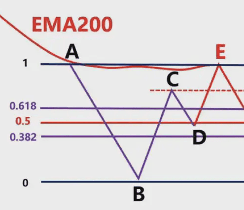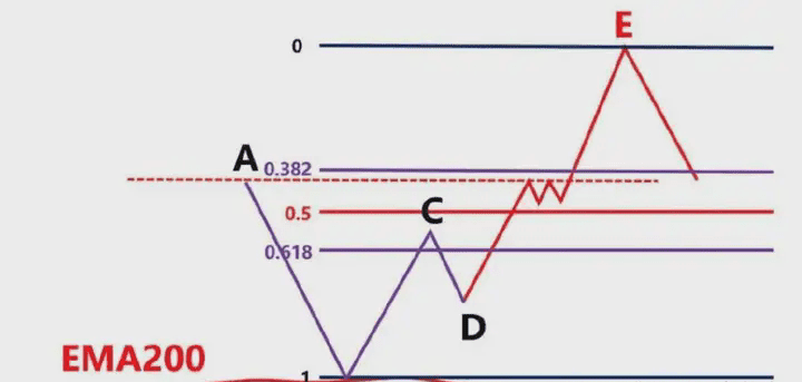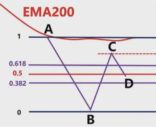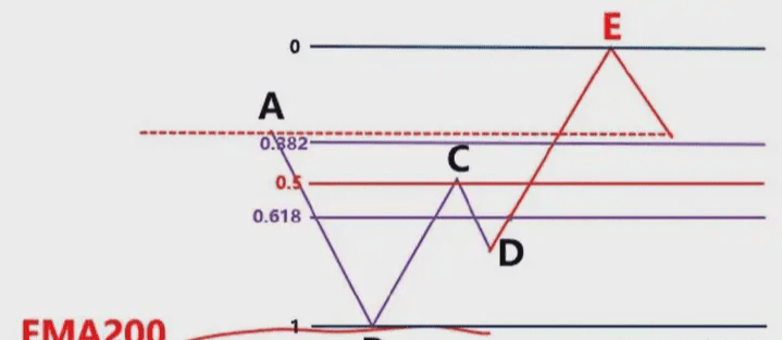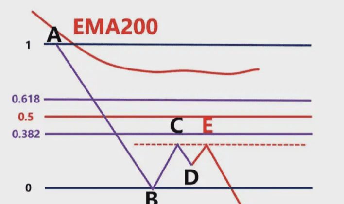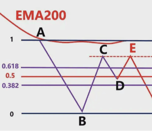 Poiché i trader che vanno long nel breve termine nel punto D chiuderanno direttamente le loro posizioni con profitti nel punto E, in base al principio delle linee equidistanti tra BC e DE. I rialzisti saranno esausti, gli ribassisti continueranno a esercitare la loro forza e i prezzi continueranno a scendere.