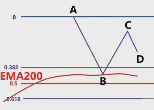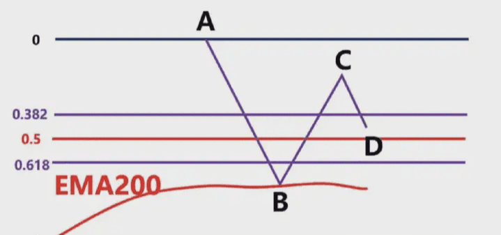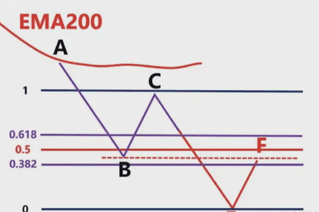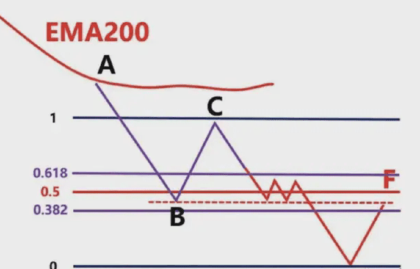 A questo punto, dobbiamo disegnare l'area di Fibonacci in base al punto massimo della banda precedente A e al punto minimo della banda precedente B, e quindi osservare se la posizione del punto C si trova nell'area di posizione 0,382-0,618 di questo ritracciamento di Fibonacci.
