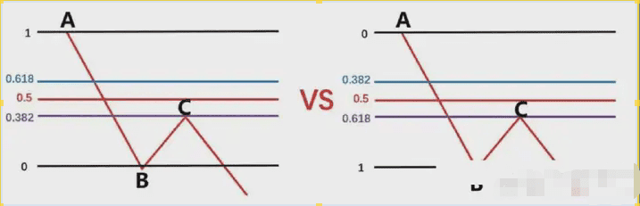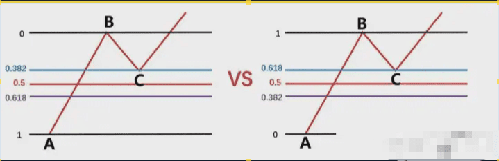 Dobbiamo quindi disegnare la sequenza di Fibonacci in base al punto massimo della banda precedente A e al punto minimo della banda precedente, e poi osservare se l'area del punto B corrisponde all'area di posizione 0,382-0,618 di questo ritracciamento di Fibonacci.