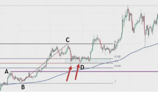 In questo momento, il prezzo è sceso dal punto massimo C al punto D. Nel punto D, è possibile che salga o scenda. Consideriamo innanzitutto l'ipotesi che salirà. Come dovremmo disegnare l'area di Fibonacci?