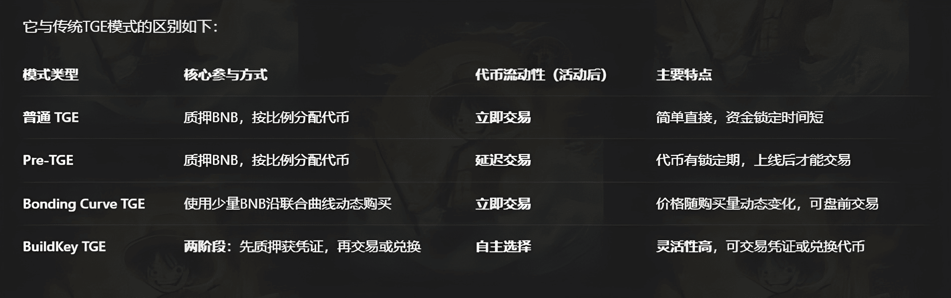 Il portafoglio Binance ha lanciato un nuovo modello di generazione di token chiamato BuildKey, che combina le caratteristiche di Pre-TGE e Bonding Curve TGE, con l'obiettivo di fornire agli utenti un modo di partecipazione più flessibile e equo.