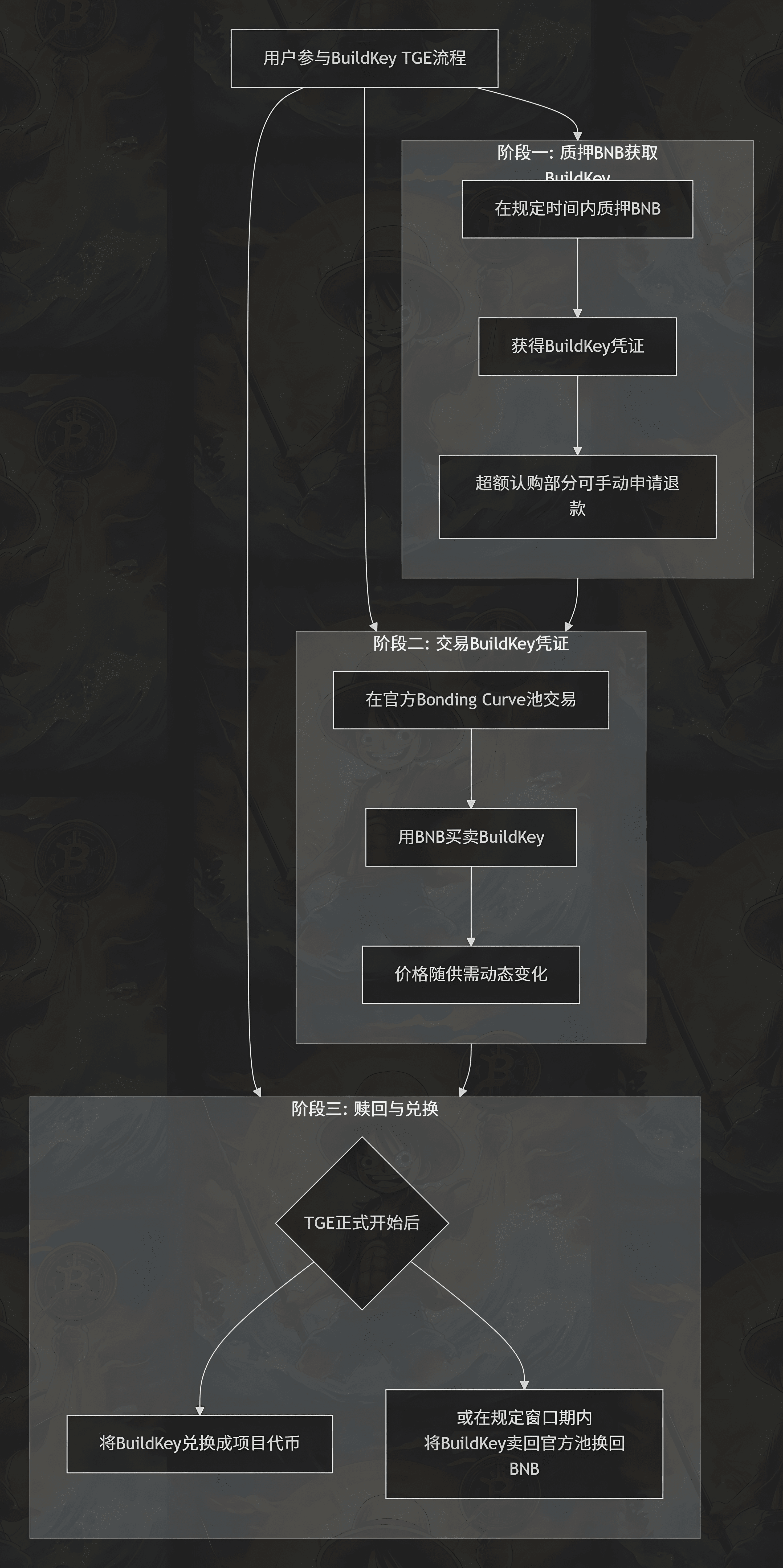 Il BuildKey TGE è un processo di emissione di token a più fasi progettato da Binance. Il suo nucleo risiede nel fatto che gli utenti ottengono BuildKeys (un certificato che rappresenta la quota di token) depositando BNB, che possono essere scambiati nella Bonding Curve o mantenuti fino al TGE per essere scambiati con i veri token di progetto.