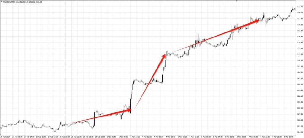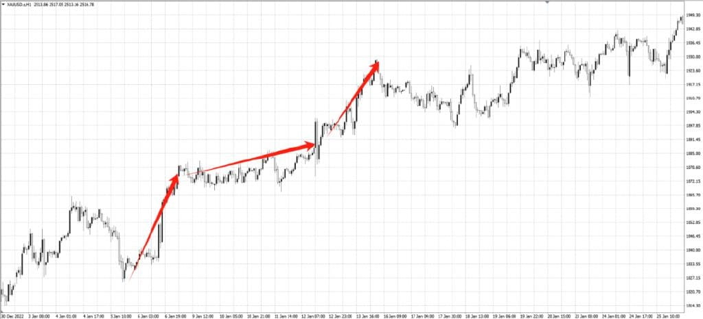 Il mercato passa da una lenta salita a una forte salita. La fase rialzista di cui abbiamo parlato prima è di questo tipo.