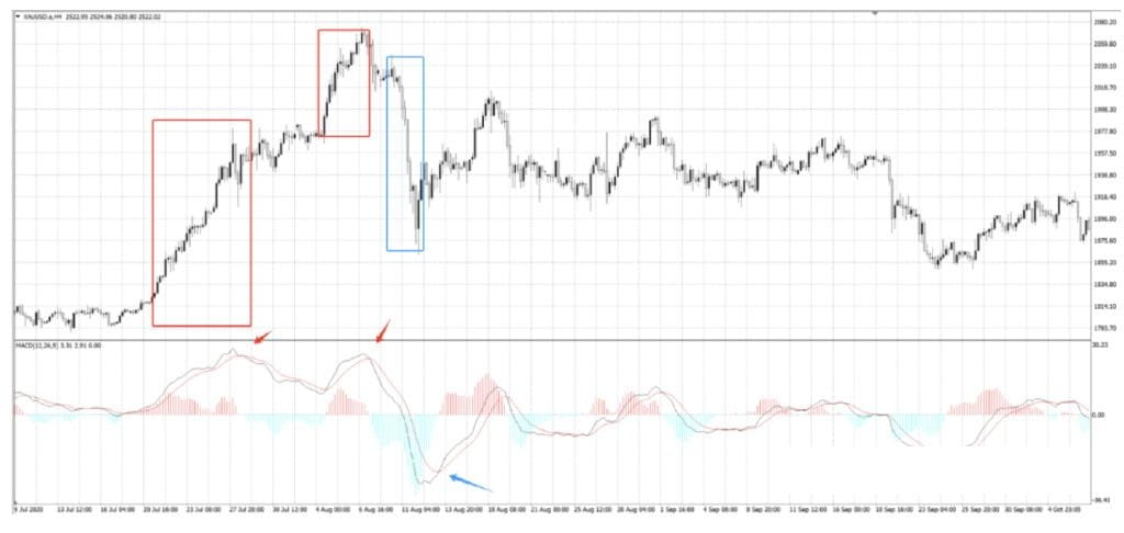 Solo quando vediamo le doppie linee del MACD incrociarsi a un livello alto e la colonna verde aumentare significativamente di volume, si ha una divergenza e un'inversione.
