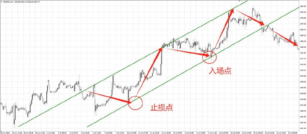 Pertanto, in un rialzo intermedio, generalmente entriamo nel mercato quando tocca il bordo inferiore della linea del canale e impostiamo uno stop loss al minimo precedente.