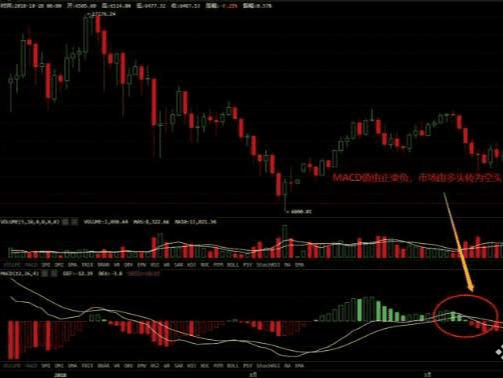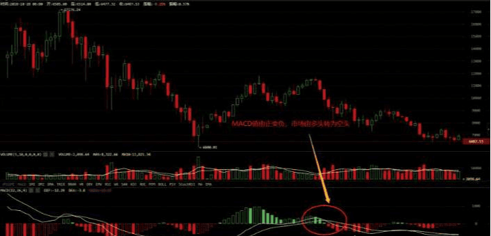 2. MACD da verde a rosso: il valore MACD passa da positivo a negativo, il mercato passa da rialzista a ribassista.