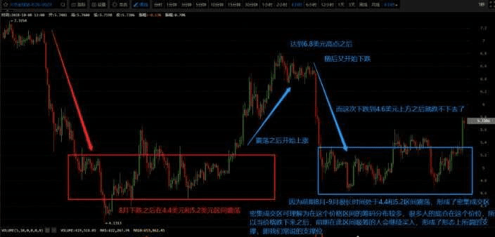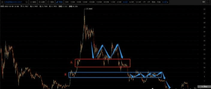 Dopo aver ingrandito il grafico K, cerchiamo se ci sono aree di transazione dense. Potete sorprendentemente scoprire che a marzo EOS ha oscillato proprio nell'intervallo di 4 dollari prima di iniziare un grande mercato ad aprile, quindi quando il mercato rialzista è finito e il prezzo è sceso al punto di partenza iniziale,
