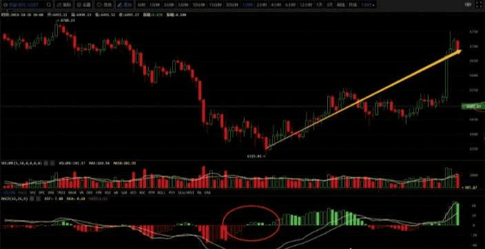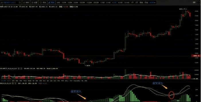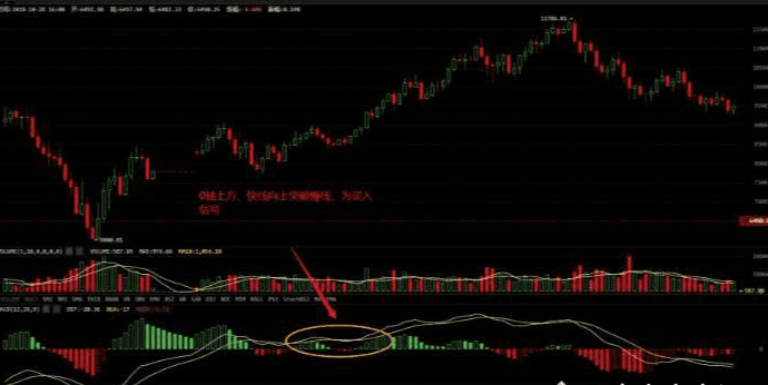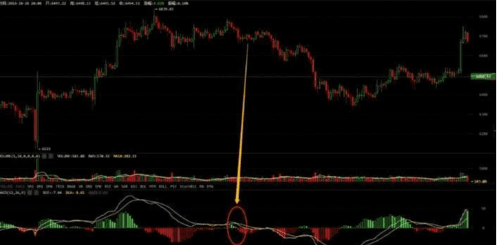 Tutti possono vedere che quando la linea bianca del MACD attraversa la linea gialla, nel grafico il MACD forma un incrocio dorato e il prezzo inizia a salire. Quando il MACD continua a salire, il prezzo è anche in una fluttuazione ascendente, quindi l'incrocio dorato del MACD può essere visto come un semplice segnale di acquisto.
