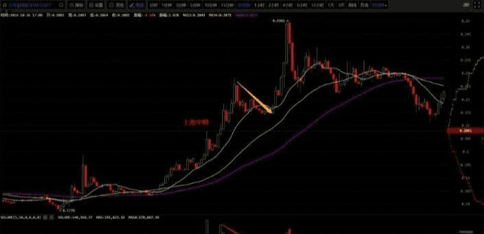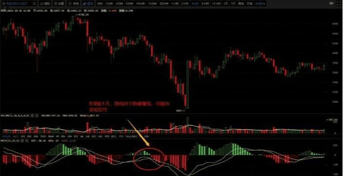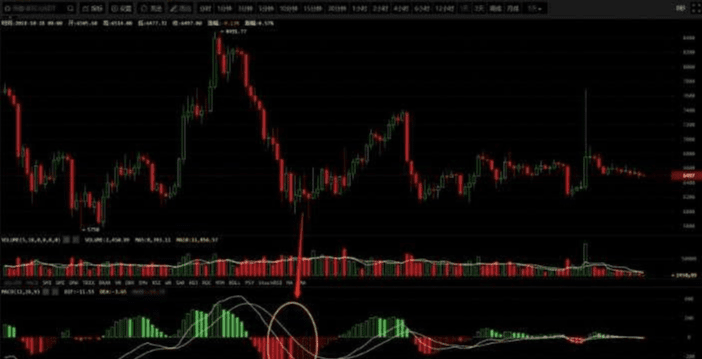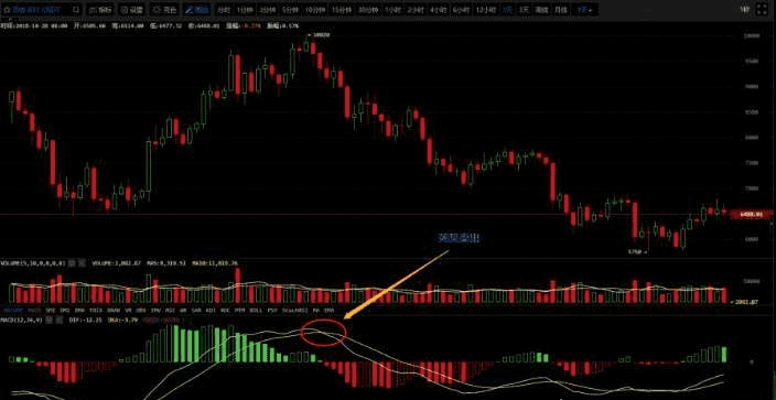 Nell'immagine del grafico K di BTC sopra, possiamo vedere che quando la linea bianca dell'indicatore MACD attraversa la linea gialla, questo viene chiamato stato di incrocio mortale.
