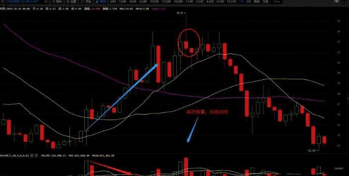 Volume in aumento e prezzo in diminuzione: l'aumento del volume degli scambi porta a un calo dei prezzi, dopo un notevole aumento dei prezzi, un numero sempre maggiore di investitori che vendono porta a un calo dei prezzi. Questo fenomeno di volume in aumento e prezzo in diminuzione a livelli elevati è un segnale di vendita.