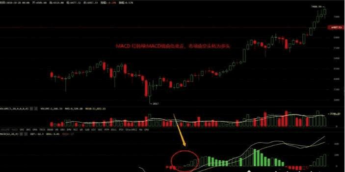 3. MACD da rosso a verde: il valore MACD passa da negativo a positivo, il mercato passa da ribassista a rialzista.