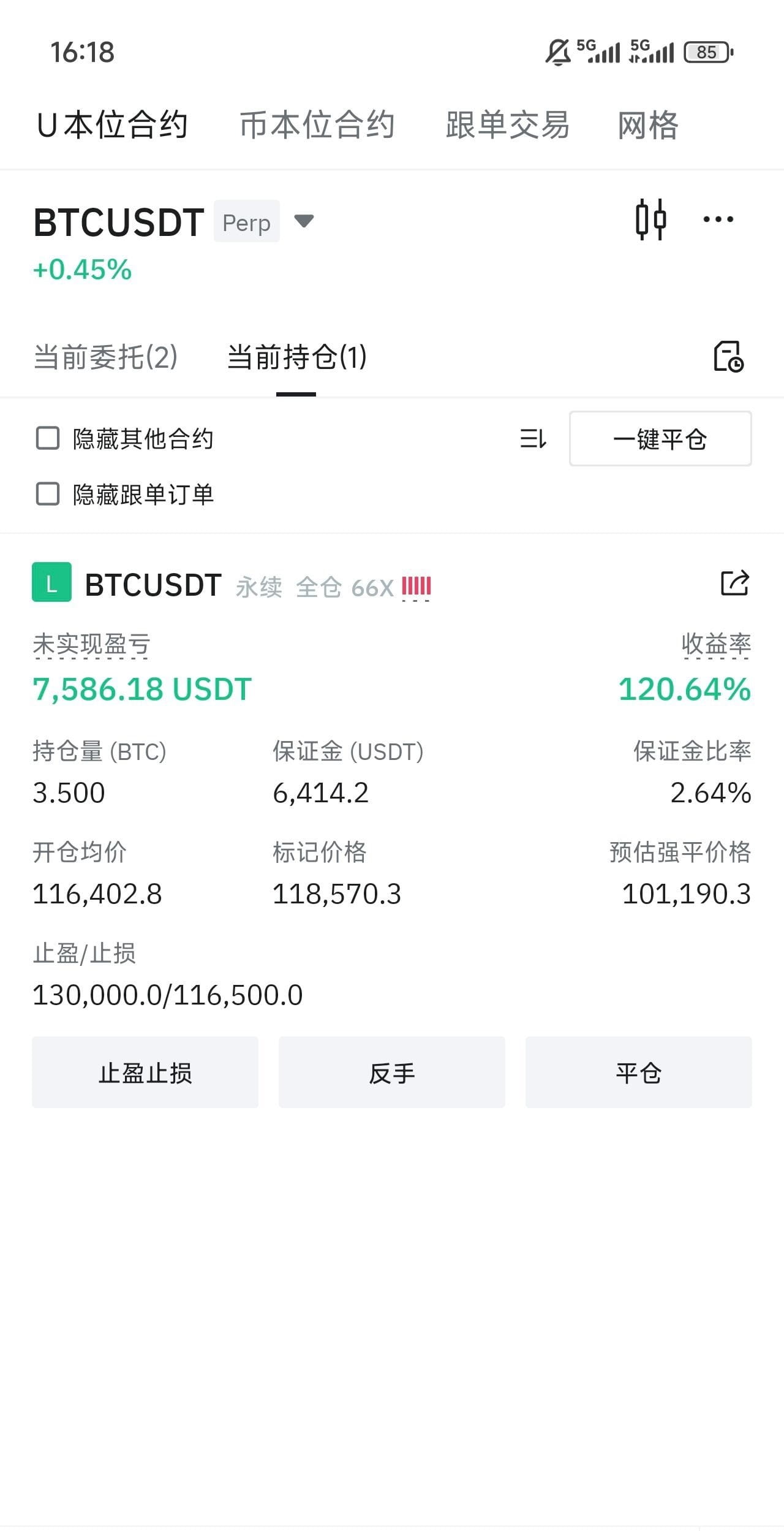 Ultima volta che dopo un supporto BTC è uscito un candela rialzista a volume, ho aperto una posizione long con leva 3x, impostando uno stop loss del 2% e un take profit del 7%.