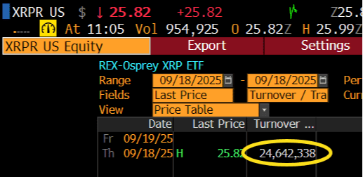 Screenshot della piattaforma finanziaria che mostra i dati di trading dell'ETF Rex XRP. Il codice azionario è $XRPP, prezzo attuale 25,82, volume scambiato 24.642.338, data 18 settembre 2025, ora 11:05, mostrando contemporaneamente il range di prezzo, l'ultimo scambio e il volume scambiato.