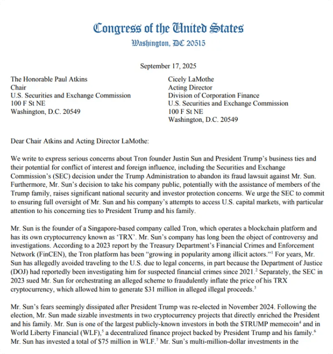 Il 17 settembre, il senatore democratico americano Jeff Merkley e il rappresentante Sean Casten hanno inviato una lettera congiunta al presidente della Commissione per i titoli e gli scambi degli Stati Uniti (SEC) Paul Atkins, ponendo domande severe alla SEC e richiedendo spiegazioni sulla sospensione delle azioni di enforcement contro Sun Yuchen e sul comportamento di Tron nell'acquisizione inversa per approdare al Nasdaq.
