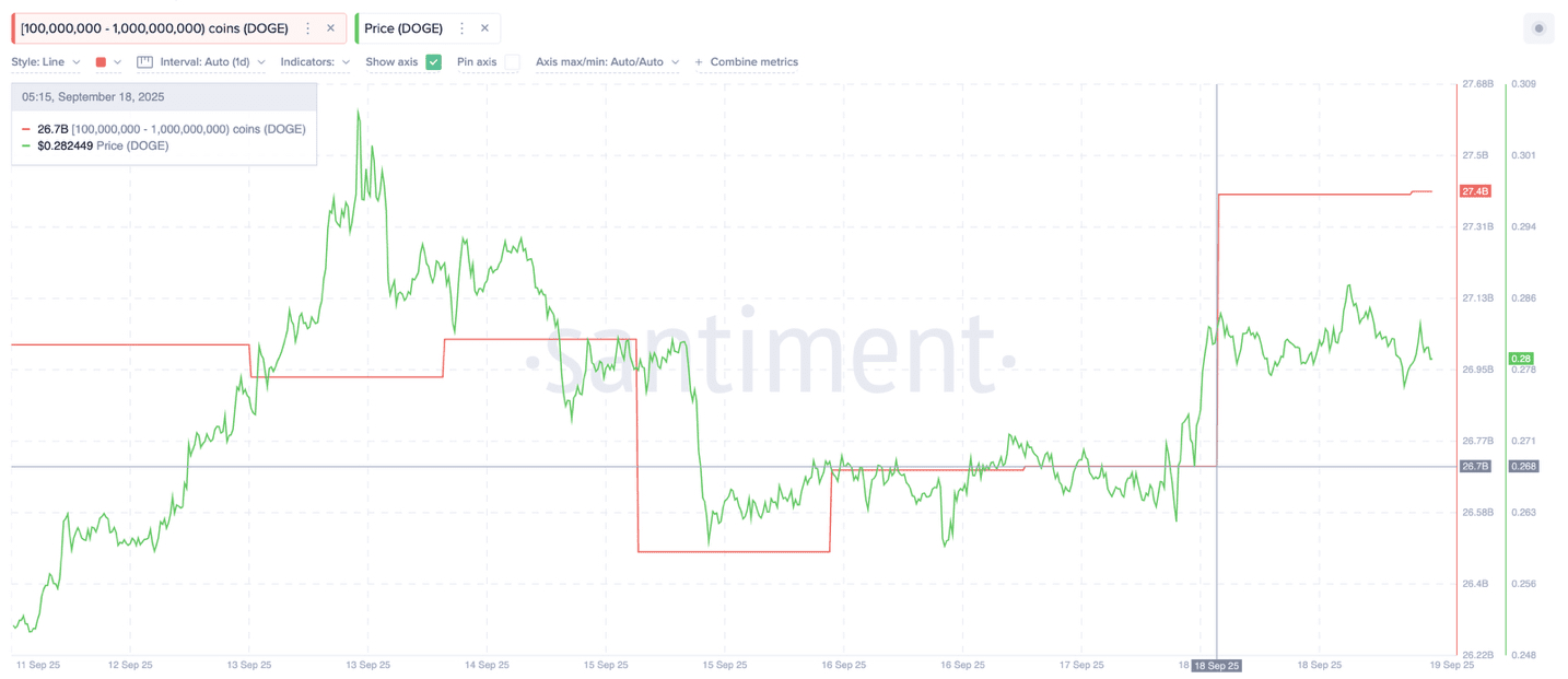 I grandi detentori hanno aumentato la loro attività da quando il clamore riguardo alla riduzione dei tassi di interesse da parte della Fed e l'introduzione dell'ETF Dogecoin al CBOE (Borsa delle opzioni di Chicago) si sono calmati. Il gruppo che detiene da 100 milioni a 1 miliardo di DOGE ha aumentato le proprie riserve da 26,7 miliardi il 17 settembre a 27,4 miliardi il 18 settembre.