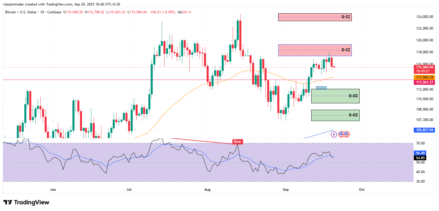 Scala di zone: Il prossimo obiettivo al rialzo si trova nell'offerta giornaliera più alta intorno a 123–124k se 118–119.5k viene superato; le zone di domanda giornaliera al ribasso si raggruppano ~112–111k e ~109–108k.