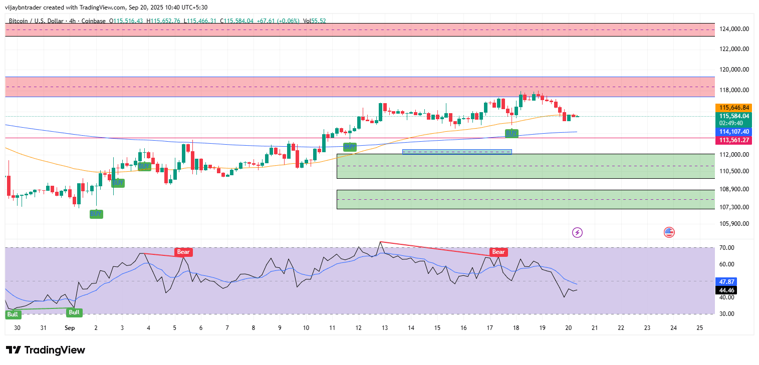 Punto chiave: Il rischio di pullback a breve termine è elevato dopo il rifiuto dell'offerta e l'ammorbidimento dell'RSI su 1h/4h; il percorso rialzista riprende solo con una rottura e un ritest confermati sopra 118k mentre l'RSI rimane sopra 50 su tutti i frame intraday.