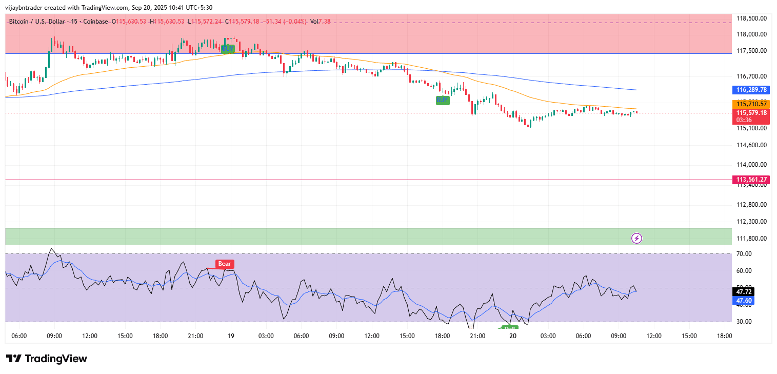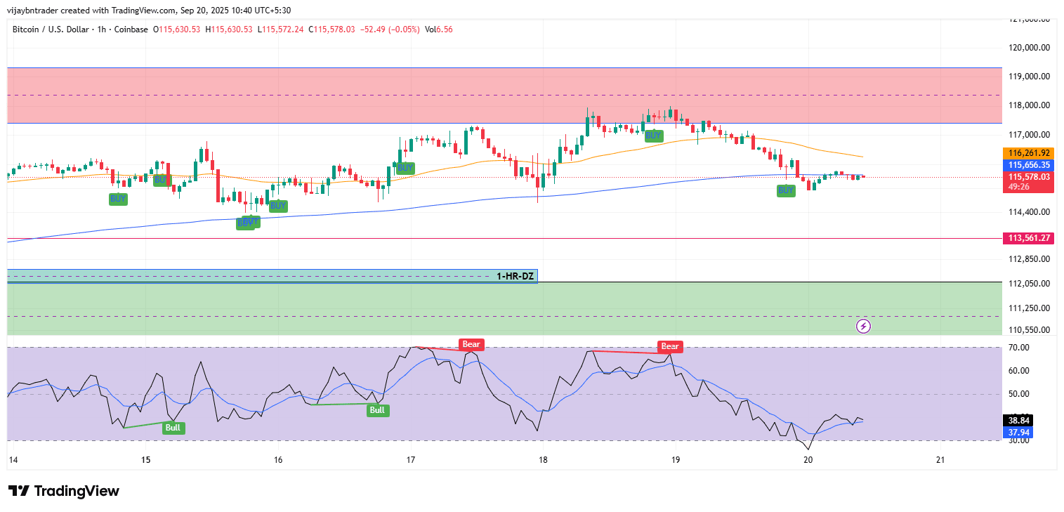 Filtro di momentum: Un recupero sostenuto dell'RSI sopra 50 conferma l'accettazione del trend; rimanere sotto 50 aumenta le probabilità di una rotazione di intervallo verso 114.8–115.2k prima e, se perso, 112.0–112.7k domanda di 1h.
