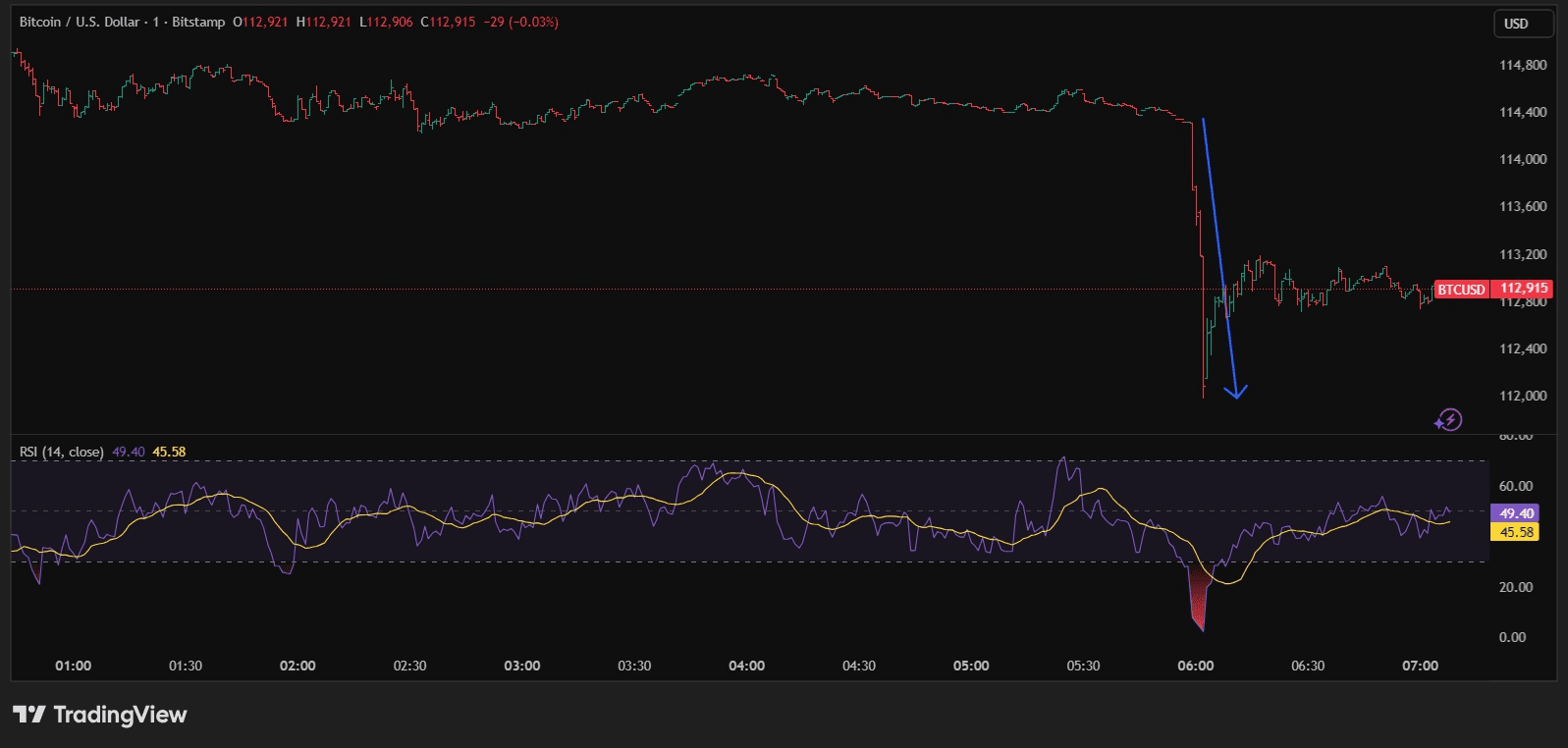 La criptovaluta più grande per capitalizzazione di mercato è scesa in pochi minuti da circa $114 400 a quasi $112 000, per poi stabilizzarsi vicino a $112 900.