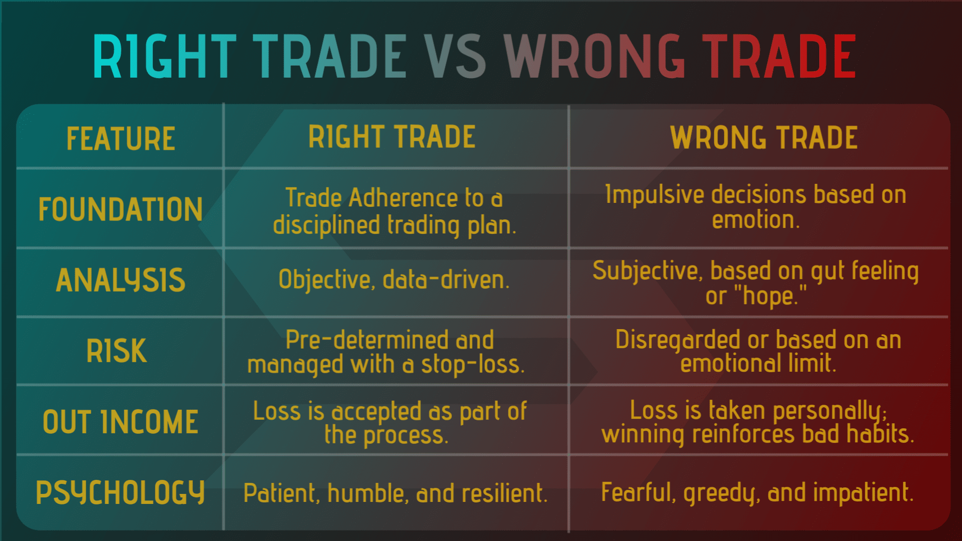 Nel contesto del trading finanziario, le idee di un "commercio sbagliato" e di un "commercio corretto" riguardano meno il risultato (guadagno o perdita) e più il processo, la psicologia e l'aderenza a una strategia definita. Un commercio che porta a una perdita può ancora essere un "commercio corretto," mentre un commercio che guadagna può essere un "commercio sbagliato."