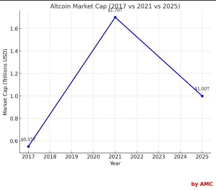 Es ko ghoor se dekhna ye Alts ke markit cap ha 1 side or 2nd side horizontal me me NY year share kiye es grap ko samjo to Samaj me Aaye ga k 2017 k alts ke ralley ko compare karo to 2025 ka alts season complete ho Chuka ha ma ma 12345678901 but if we compare it with 2021 ye almost complete hony k kareeb ha sub k mind me 1 question Aaye ga 2017 me to coin 20x howy the and 2021 5x to 10x ma ma 12345678901 but 2025 me ASA howa e nhe so alts season kesy ..