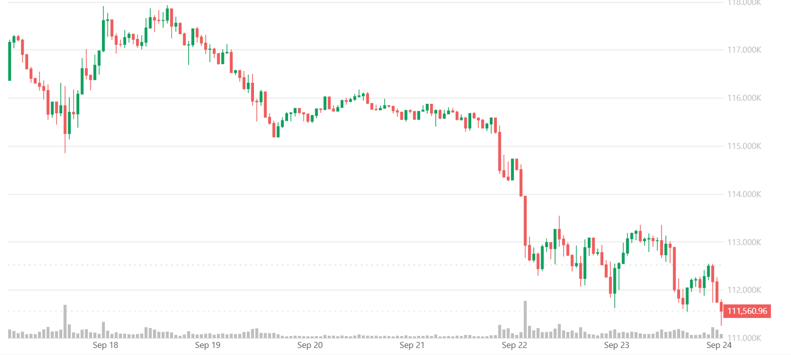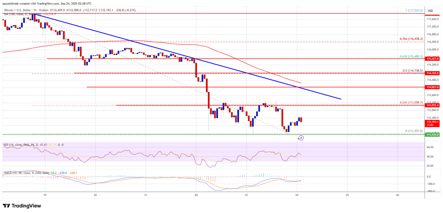 Il prezzo di Bitcoin non è riuscito a mantenersi sopra i 115.500 dollari e ha avviato un nuovo ciclo di ribasso. BTC è sceso sotto i livelli di supporto di 115.000 dollari e 114.000 dollari, entrando in una zona ribassista a breve termine. La discesa si accelera al di sotto dei 113.500 dollari. Il minimo è sceso a 111.557 dollari, mentre il prezzo attuale è al di sotto del 23.6% del ritracciamento di Fibonacci dalla discesa da 117.920 dollari al minimo di 111.557 dollari.