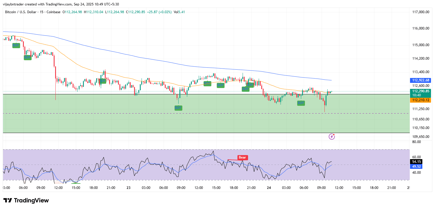 Esecuzione: L'RSI intraday è tornato verso 50 dopo un rimbalzo da 112.3k; evita di inseguire nello scaffale MA di 1h, e compra solo il ripristino che si mantiene sopra i livelli recuperati con RSI >50 per ridurre le false rotture.