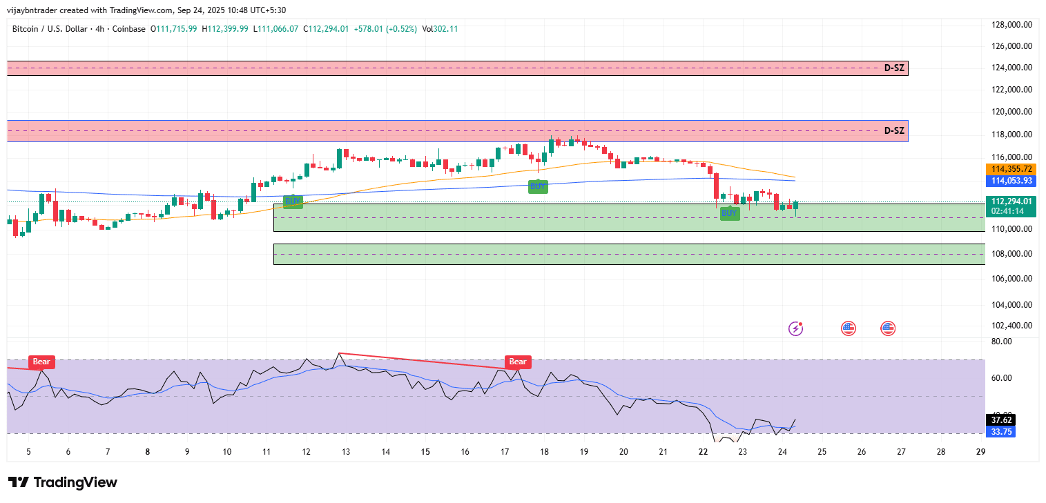 Zone: La domanda attiva di 4h 112.9k–111.3k ha reagito più volte; se fallisce su una chiusura, la prossima domanda di 4h si trova ~109.3k–108.1k.