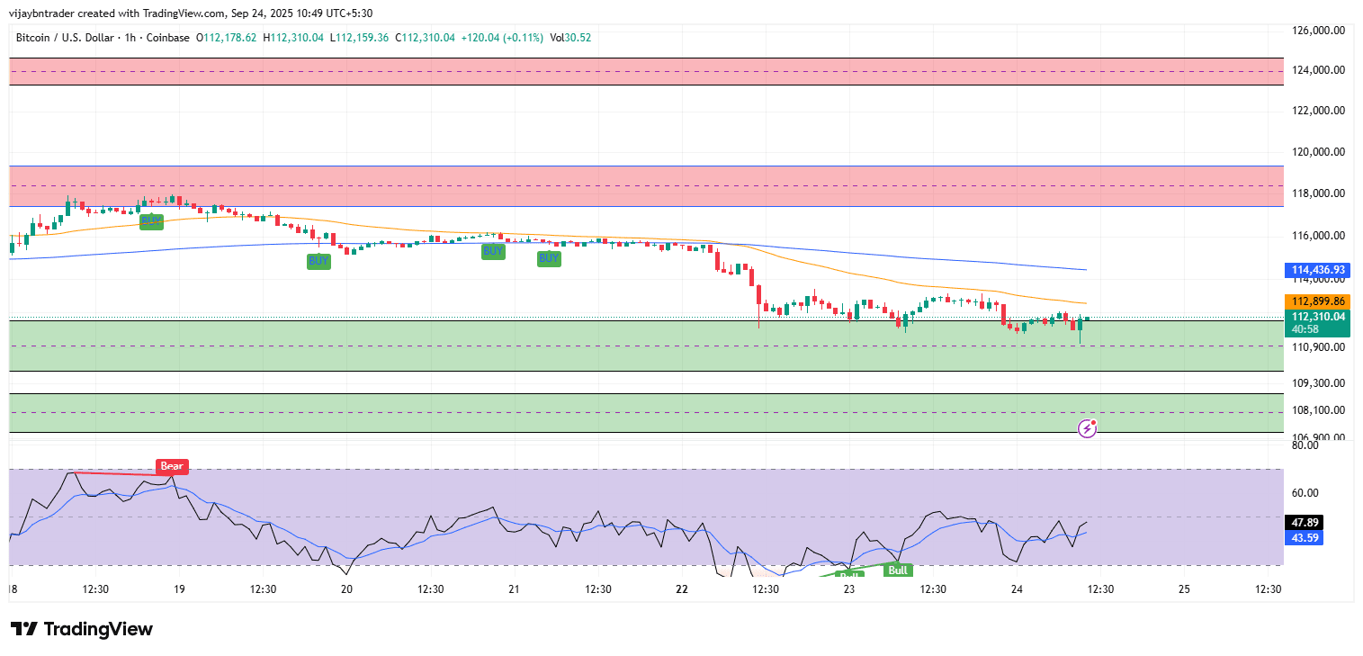 BTC si sta stabilizzando a 112,90k–112,20k di domanda dopo una vendita controllata, ma la tendenza rimane fragile al di sotto del cluster della media mobile 1h/4h; i tentativi di rialzo devono riconquistare 112,90k poi 114,05k–114,35k e mantenere con RSI >50 su 1h/4h per mirare a 116,00k e il range di offerta 117,80k–118,80k.