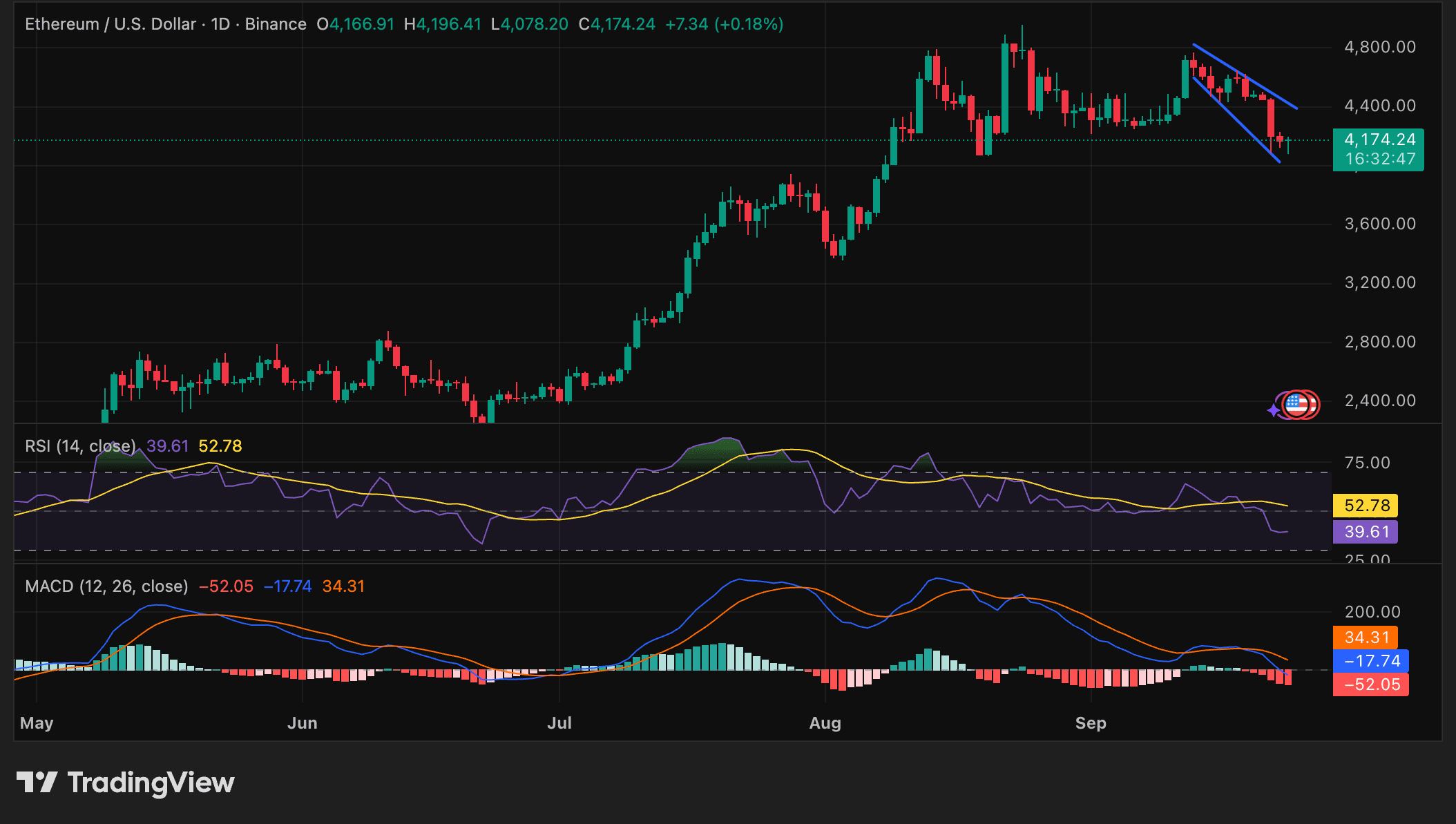 Al momento della pubblicazione, Ethereum è scambiato a 4.180 dollari, in calo di circa lo 0,63% dopo un modesto recupero dai minimi di circa 4.070 dollari di oggi. Negli ultimi giorni, la seconda criptovaluta più grande ha mostrato principalmente un trend laterale, scendendo di circa l'8% nell'ultima settimana.