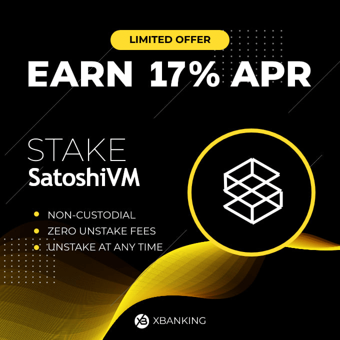 Se metti i token SatoshiVS (SAVM) nello staking sulla piattaforma XBANKING, puoi guadagnare fino al 17% di APR.