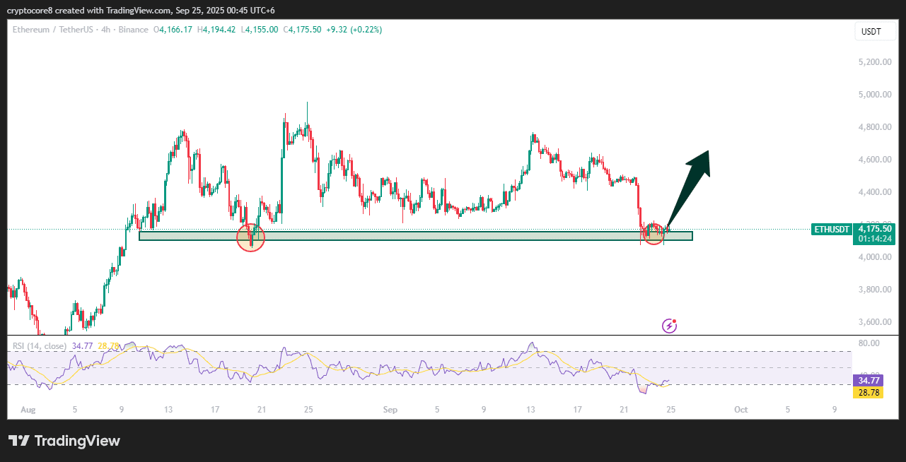 Questo grafico di Ethereum mostra il prezzo rimbalzare da una forte zona di supporto con conferma rialzista. L'RSI si sta riprendendo da condizioni di ipervenduto, suggerendo un momento rialzista. Con test di supporto ripetuti che si mantengono, il mercato segnala forza, portando probabilmente ETH verso livelli di resistenza più elevati presto.