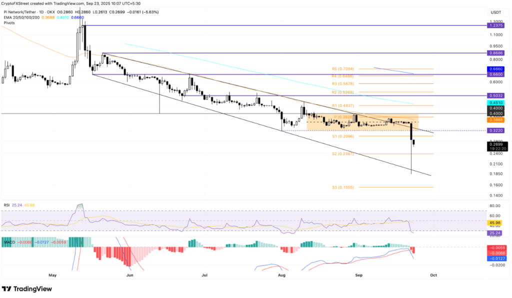 Alla data di martedì, Pi Network sta ancora scambiando intorno a 0,2700 USD, con tre sessioni di ribasso consecutive. Questi sviluppi hanno distrutto i precedenti tentativi di uscire dal trend ribassista, avvicinando il prezzo al supporto critico S2 a 0,2387 USD.