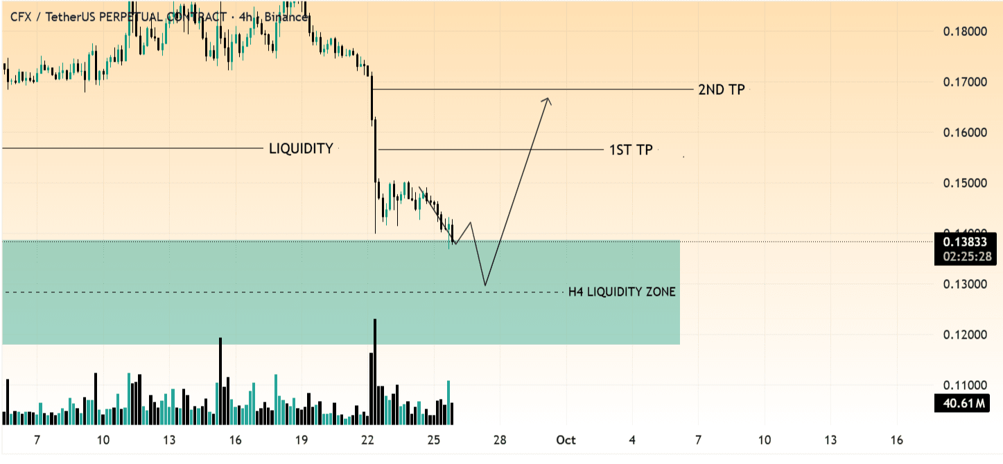 CFX ha acquisito molta liquidità su H1, H4 e timeframe giornalieri. Se guardi H4, CFX era in un intervallo molto ampio e dopo aver acquisito la sua liquidità, ha raggiunto la nostra zona H4 ad alta probabilità, che è il livello del gap di valore equo. Se guardi i volumi su H4, mostra che CFX scenderà un po' e rimbalzerà dopo aver preso gli StopLoss dei trader al dettaglio. Ho fornito la zona di ingresso qui sotto per acquistare.