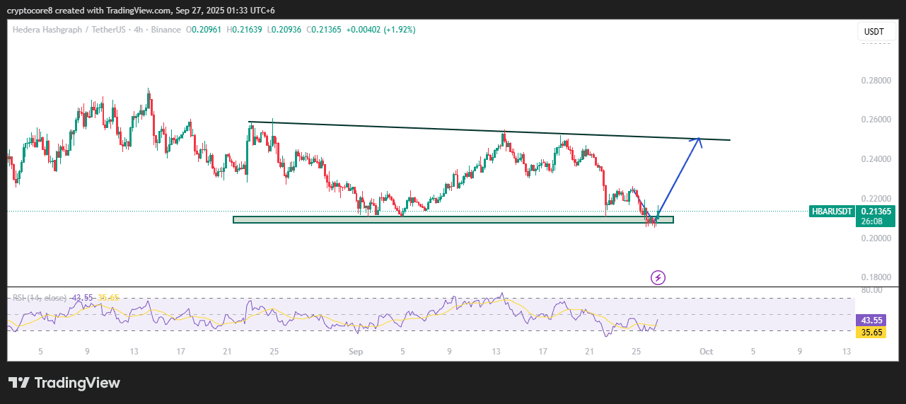 Questo grafico HBAR mostra il prezzo che rimbalza da un forte supporto, con l'RSI che recupera da livelli di ipervenduto. La freccia blu suggerisce un movimento rialzista verso la linea di tendenza di resistenza. Gli acquirenti che entrano qui potrebbero spingere il prezzo più in alto, segnalando un potenziale slancio rialzista nel prossimo futuro.