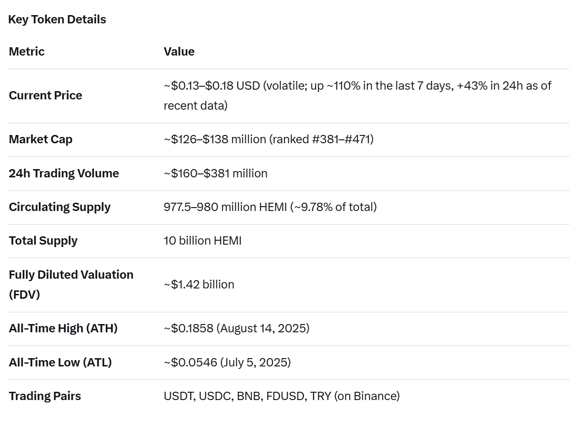- Airdrop: 100 milioni di HEMI (1% dell'offerta totale) distribuiti ai detentori di BNB idonei che hanno messo in staking in prodotti Simple Earn o On-Chain Yields dal 17 al 19 settembre 2025.