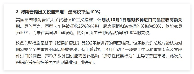 Questa volta Trump ha preso sul serio! Secondo le ultime notizie, in base all'articolo 232 del (Trade Expansion Act), prevede di imporre un'imposta del 25% sui camion pesanti, del 50% sui mobili e del 100% su alcuni farmaci a partire dal 1° ottobre, con il motivo di proteggere l'industria manifatturiera americana. Questa politica, una volta annunciata, potrebbe far scendere per prima cosa i mercati globali - storicamente, le guerre commerciali tendono a innescare inflazione e sentiment di avversione al rischio, con i capitali che si sposteranno verso l'oro o il dollaro, mentre le criptovalute, come asset rischiosi, potrebbero subire pressioni nel breve termine.