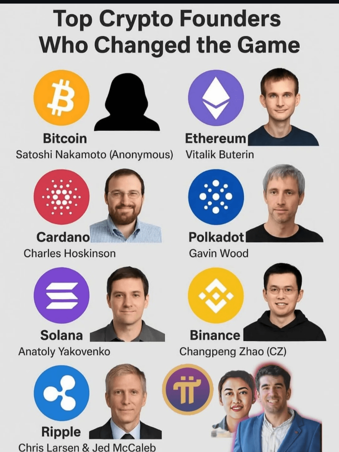 Ecco i punti in comune chiave tra Satoshi Nakamoto (Bitcoin), Changpeng Zhao (Binance), i Dott. Nicolas Kokkalis e Chengdiao Fan (Pi Network), Chris Larsen & Jed McCaleb (Ripple/XRP), Charles Hoskinson (Cardano), Gavin Wood (Polkadot), Vitalik Buterin (Ethereum) e Anatoly Yakovenko (Solana):